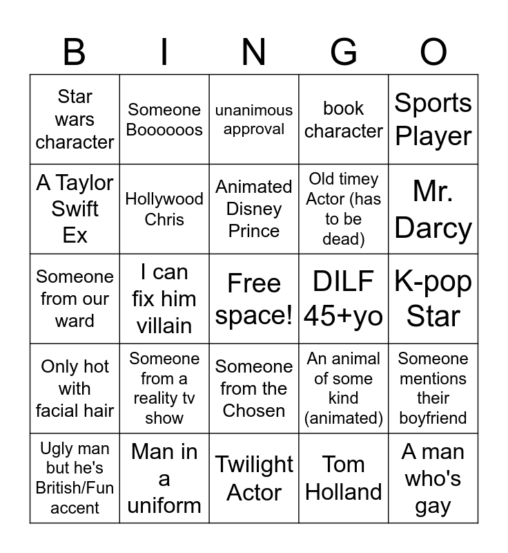 This bingo card has a free space and 24 words: Someone from a reality tv show, Man in a uniform, Animated Disney Prince, Ugly man but he's British/Fun accent, Sports Player, Star wars character, A Taylor Swift Ex, Someone Boooooos, DILF 45+yo, Someone from the Chosen, Old timey Actor (has to be dead), Someone from our ward, An animal of some kind (animated), Someone mentions their boyfriend, Hollywood Chris, Tom Holland, K-pop Star, unanimous approval, Mr. Darcy, I can fix him villain, A man who's gay, Only hot with facial hair, book character and Twilight Actor.