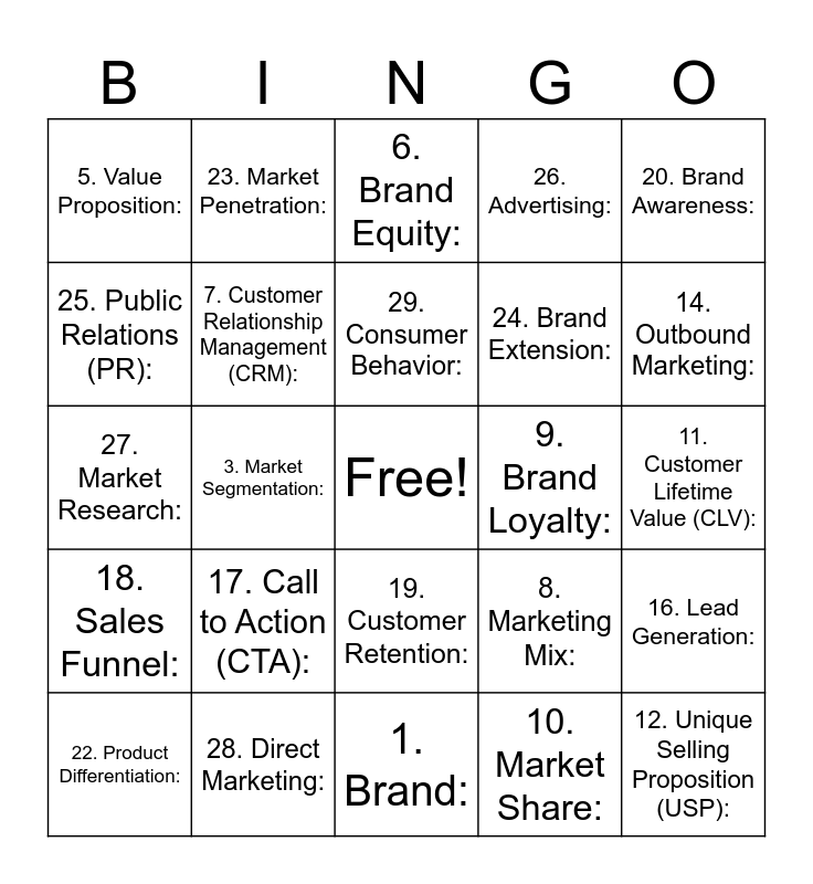 This bingo card has a free space and 31 words: 1. Brand:, 2. Target Market:, 3. Market Segmentation:, 4. Positioning:, 5. Value Proposition:, 6. Brand Equity:, 7. Customer Relationship Management (CRM):, 8. Marketing Mix:, 9. Brand Loyalty:, 10. Market Share:, 11. Customer Lifetime Value (CLV):, 12. Unique Selling Proposition (USP):, Public relations, 13. Inbound Marketing:, 14. Outbound Marketing:, 15. Conversion Rate:, 16. Lead Generation:, 17. Call to Action (CTA):, 18. Sales Funnel:, 19. Customer Retention:, 20. Brand Awareness:, 21. Digital Marketing:, 22. Product Differentiation:, 23. Market Penetration:, 24. Brand Extension:, 25. Public Relations (PR):, 26. Advertising:, 27. Market Research:, 28. Direct Marketing:, 29. Consumer Behavior: and 30. Guerrilla Marketing:.