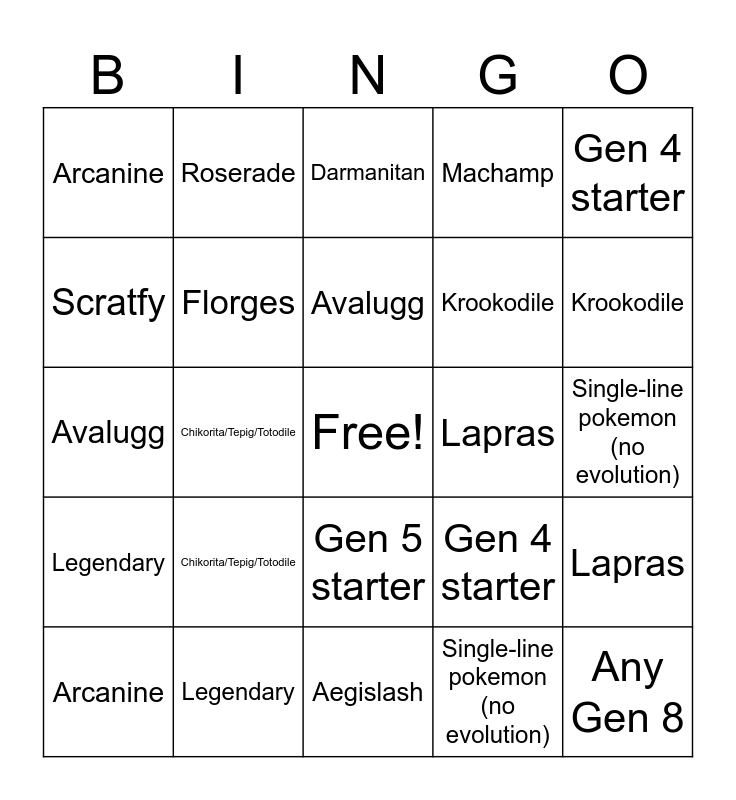 ⚠ This card has duplicate items: Arcanine (2), Gen 8 (2), Single-line pokemon (no evolution) (2), Darmanitan (2), Dusknoir (2), Gen 4 starter (2), Legendary (2), Machamp (2), Lapras (2), Gen 5 starter (2), Chikorita/Tepig/Totodile (2), Staraptor (/starter bird) (2), Aegislash (2), All eeveelutions (2), Avalugg (2), Scratfy (2), Krookodile (2), Roserade (2), Florges (2), Chandelure (2)
