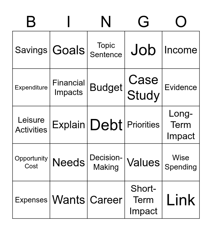 This bingo card has a free space and 24 words: Needs, Wants, Budget, Expenses, Income, Savings, Expenditure, Goals, Priorities, Decision-Making, Case Study, Leisure Activities, Values, Wise Spending, Financial Impacts, Short-Term Impact, Long-Term Impact, Topic Sentence, Evidence, Explain, Link, Opportunity Cost, Job and Career.