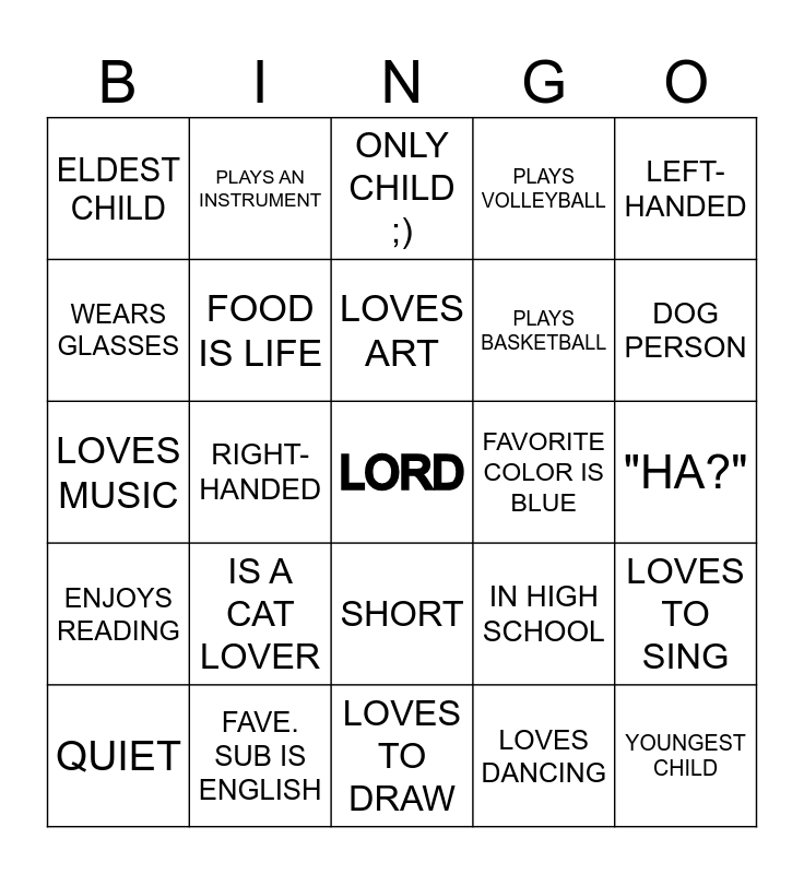 This bingo card has a free space and 24 words: IS A CAT LOVER, FAVE. SUB IS ENGLISH, LOVES ART, QUIET, LEFT-HANDED, ELDEST CHILD, WEARS GLASSES, PLAYS AN INSTRUMENT, FAVORITE COLOR IS BLUE, SHORT, PLAYS BASKETBALL, LOVES MUSIC, IN HIGH SCHOOL, LOVES TO SING, FOOD IS LIFE, LOVES DANCING, "HA?", ONLY CHILD ;), DOG PERSON, RIGHT-HANDED, YOUNGEST CHILD, ENJOYS READING, PLAYS VOLLEYBALL and LOVES TO DRAW.