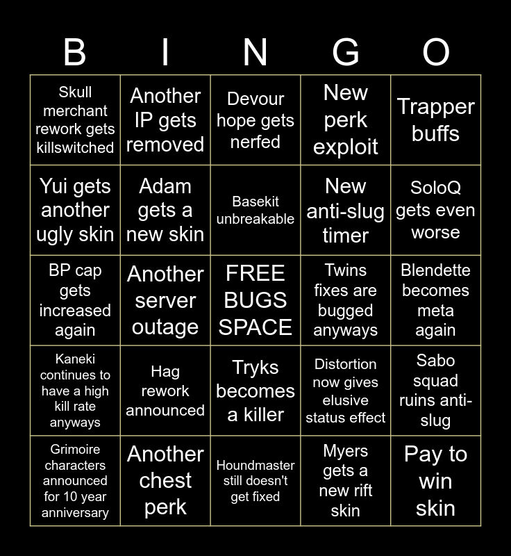 This bingo card has a free space and 24 words: Hag rework announced, Another chest perk, Basekit unbreakable, Grimoire characters announced for 10 year anniversary, Trapper buffs, Skull merchant rework gets killswitched, Yui gets another ugly skin, Another IP gets removed, Twins fixes are bugged anyways, Tryks becomes a killer, New anti-slug timer, BP cap gets increased again, Distortion now gives elusive status effect, Sabo squad ruins anti-slug, Adam gets a new skin, Myers gets a new rift skin, Blendette becomes meta again, Devour hope gets nerfed, SoloQ gets even worse, Another server outage, Pay to win skin, Kaneki continues to have a high kill rate anyways, New perk exploit and Houndmaster still doesn't get fixed.