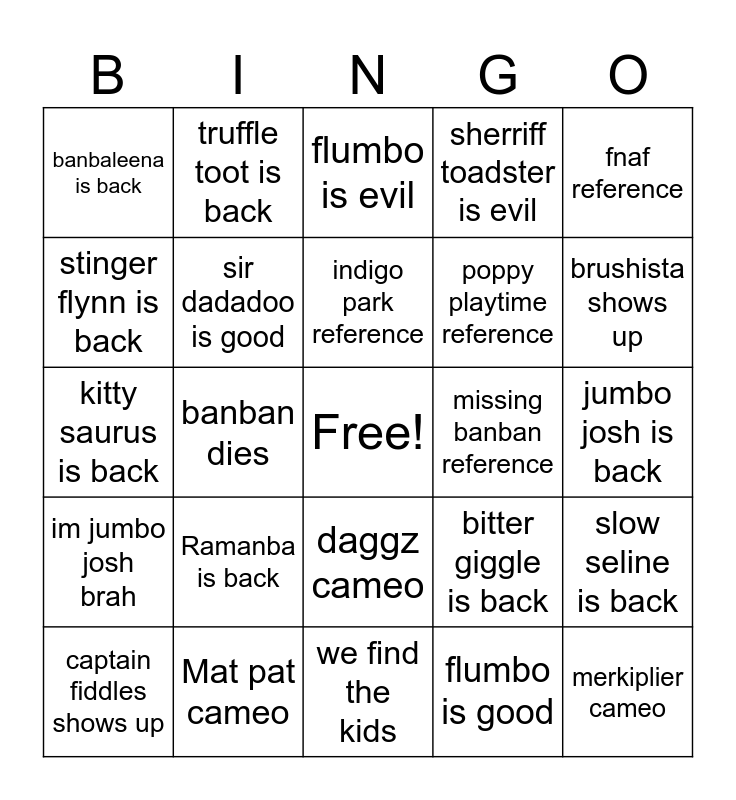 This bingo card has a free space and 24 words: Ramanba is back, Mat pat cameo, indigo park reference, captain fiddles shows up, fnaf reference, banbaleena is back, stinger flynn is back, truffle toot is back, missing banban reference, daggz cameo, poppy playtime reference, kitty saurus is back, bitter giggle is back, slow seline is back, sir dadadoo is good, flumbo is good, jumbo josh is back, flumbo is evil, brushista shows up, banban dies, merkiplier cameo, im jumbo josh brah, sherriff toadster is evil and we find the kids.