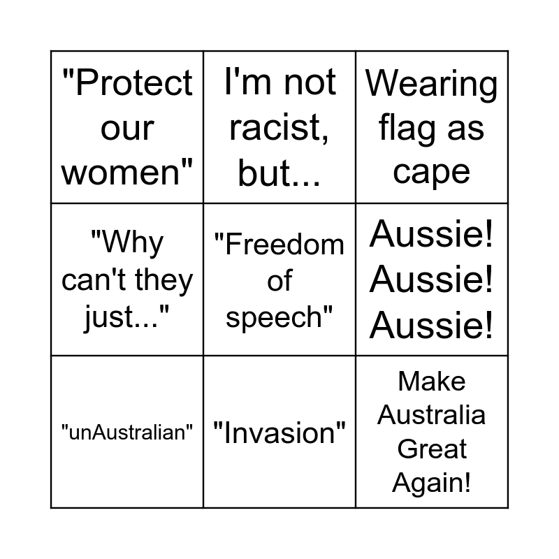 This bingo card has a free space and 8 words: Aussie! Aussie! Aussie!, Wearing flag as cape, I'm not racist, but..., "unAustralian", "Protect our women", Make Australia Great Again!, "Why can't they just..." and "Invasion".