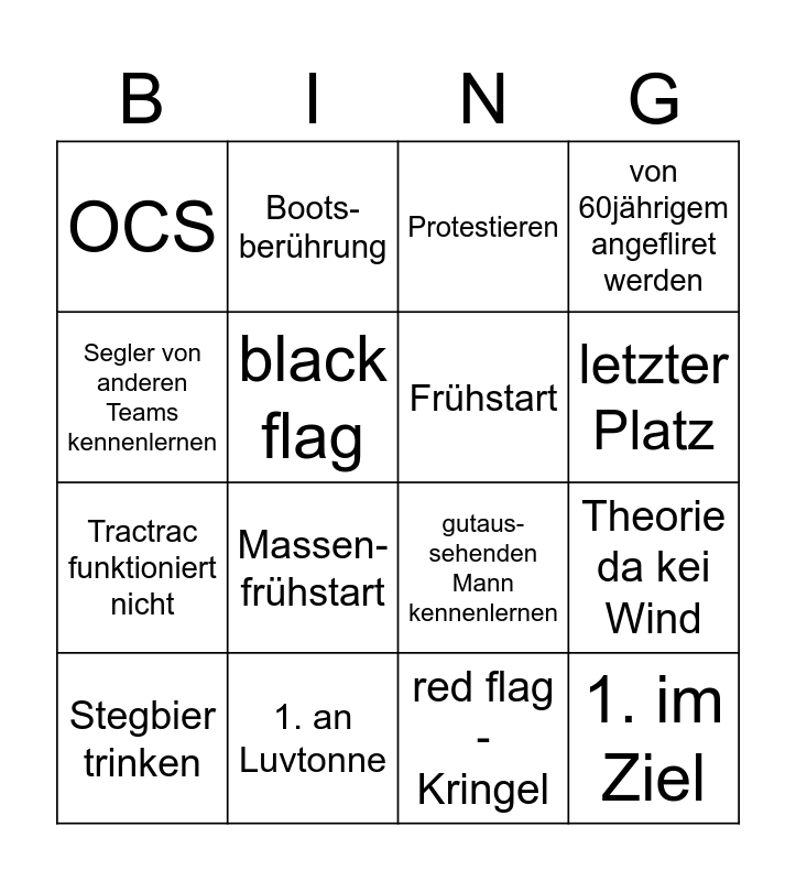 This bingo card has 16 words: 1. an Luvtonne, Theorie da kei Wind, Protestieren, OCS, Tractrac funktioniert nicht, Boots-berührung, gutaus-sehenden Mann kennenlernen, red flag - Kringel, Segler von anderen Teams kennenlernen, black flag, Stegbier trinken, von 60jährigem angefliret werden, Massen-frühstart, letzter Platz, Frühstart and 1. im Ziel.
