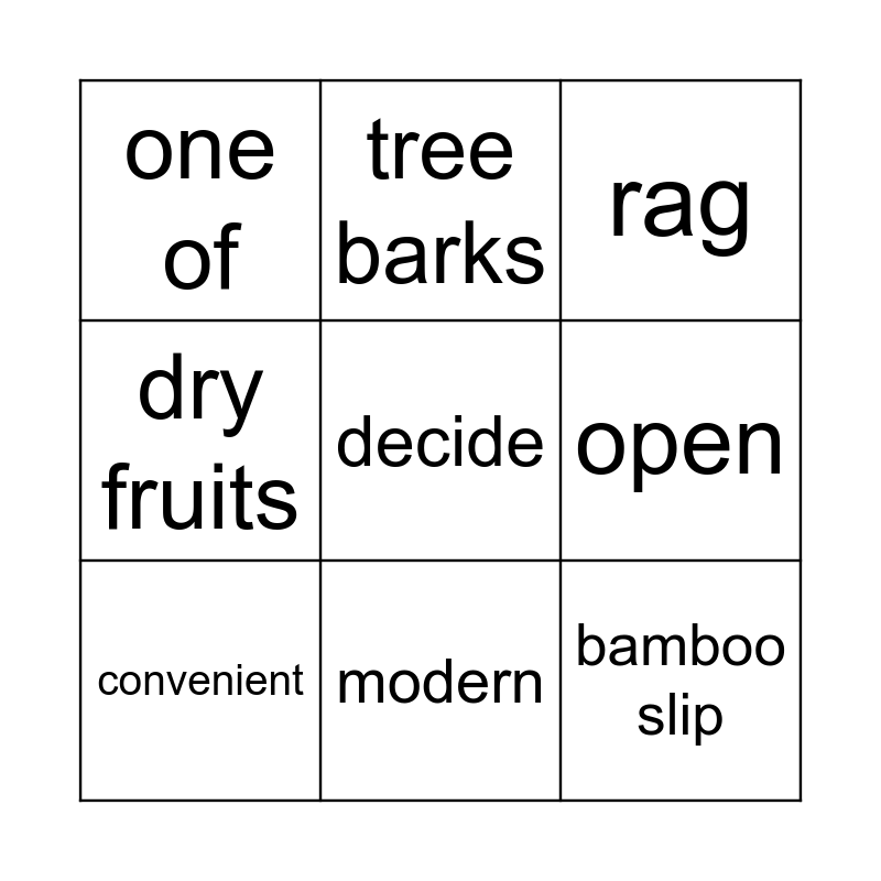 This bingo card has a free space and 11 words: paper making, modern, bamboo slip, convenient, tree barks, rag, open, make phone call, dry fruits, one of and FREE.