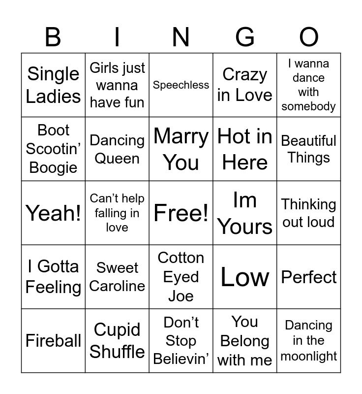 This bingo card has a free space and 24 words: Sweet Caroline, Cupid Shuffle, Marry You, Fireball, I wanna dance with somebody, Single Ladies, Boot Scootin’ Boogie, Girls just wanna have fun, Im Yours, Cotton Eyed Joe, Hot in Here, Yeah!, Low, Perfect, Dancing Queen, You Belong with me, Thinking out loud, Speechless, Beautiful Things, Can’t help falling in love, Dancing in the moonlight, I Gotta Feeling, Crazy in Love and Don’t Stop Believin’.
