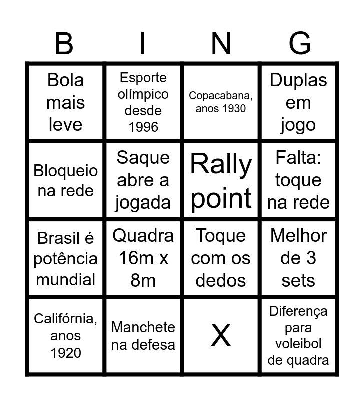This bingo card has 17 words: X, Califórnia, anos 1920, Copacabana, anos 1930, Bola mais leve, Quadra 16m x 8m, Duplas em jogo, Melhor de 3 sets, Rally point, Falta: toque na rede, Saque abre a jogada, Manchete na defesa, Toque com os dedos, Bloqueio na rede, Esporte olímpico desde 1996, Brasil é potência mundial, Jogadores famosos citados and Diferença para voleibol de quadra.