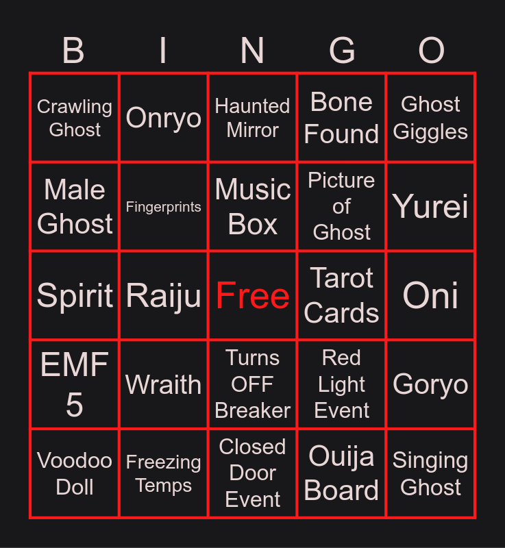 This bingo card has a free space and 62 words: Female ghost, Freezing Temps, Orbs, EMF 5, Writing, D.O.T.S, Fingerprints, Spirit Box, Picture of Ghost, Died, Bone Found, Dirty Water, Male Ghost, Naked Ghost, Shadow Ghost, Crawling Ghost, Singing Ghost, Ghost Giggles, Summoning Circle, Music Box, Tarot Cards, Haunted Mirror, Voodoo Doll, Ouija Board, Shade, The Mimic, Banshee, Demon, Goryo, Hantu, Jinn, Mare, Myling, Obake, Oni, Onryo, Phantom, Poltergeist, Raiju, Revenant, Spirit, The Twins, Wraith, Yokai, Yurei, Red Light Event, Phone Rings, Rocking Chair Interaction, Radio Interaction, Turns ON Breaker, Turns OFF Breaker, Closed Door Event, Double Fingerprint, 6 Fingers, Escaped a Hunt, Motion Sensor Presence, Prevent a Hunt w/ Cruci, Blows Out Candle, Died From Tarot Cards, Footprints, 3 Star Ghost Photo and 3 Star Cursed Object Photo.