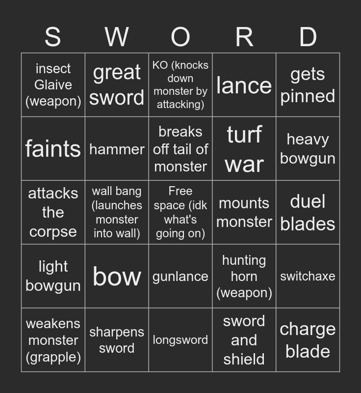 This bingo card has a free space and 24 words: bow, sharpens sword, breaks off tail of monster, weakens monster (grapple), gets pinned, insect Glaive (weapon), faints, great sword, mounts monster, gunlance, turf war, attacks the corpse, hunting horn (weapon), switchaxe, hammer, sword and shield, duel blades, KO (knocks down monster by attacking), heavy bowgun, wall bang (launches monster into wall), charge blade, light bowgun, lance and longsword.