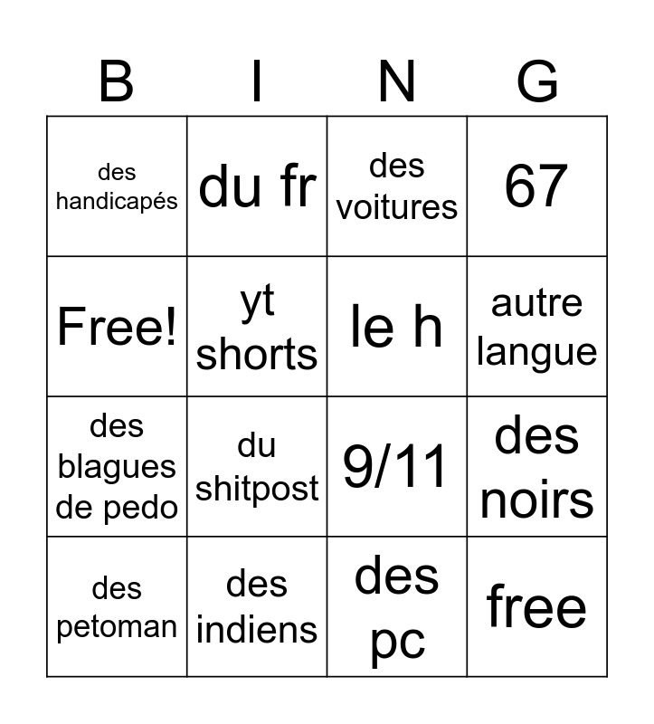 This bingo card has 16 words: des indiens, des noirs, des voitures, des handicapés, des blagues de pedo, du fr, 9/11, des pc, Free!, yt shorts, des petoman, 67, du shitpost, autre langue, le h and free.