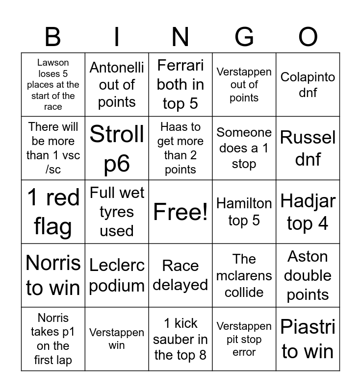 This bingo card has a free space and 24 words: Leclerc podium, Verstappen win, Haas to get more than 2 points, Norris takes p1 on the first lap, Colapinto dnf, Lawson loses 5 places at the start of the race, There will be more than 1 vsc /sc, Antonelli out of points, Hamilton top 5, Race delayed, Someone does a 1 stop, 1 red flag, The mclarens collide, Aston double points, Stroll p6, Verstappen pit stop error, Hadjar top 4, Ferrari both in top 5, Russel dnf, Full wet tyres used, Piastri to win, Norris to win, Verstappen out of points and 1 kick sauber in the top 8.