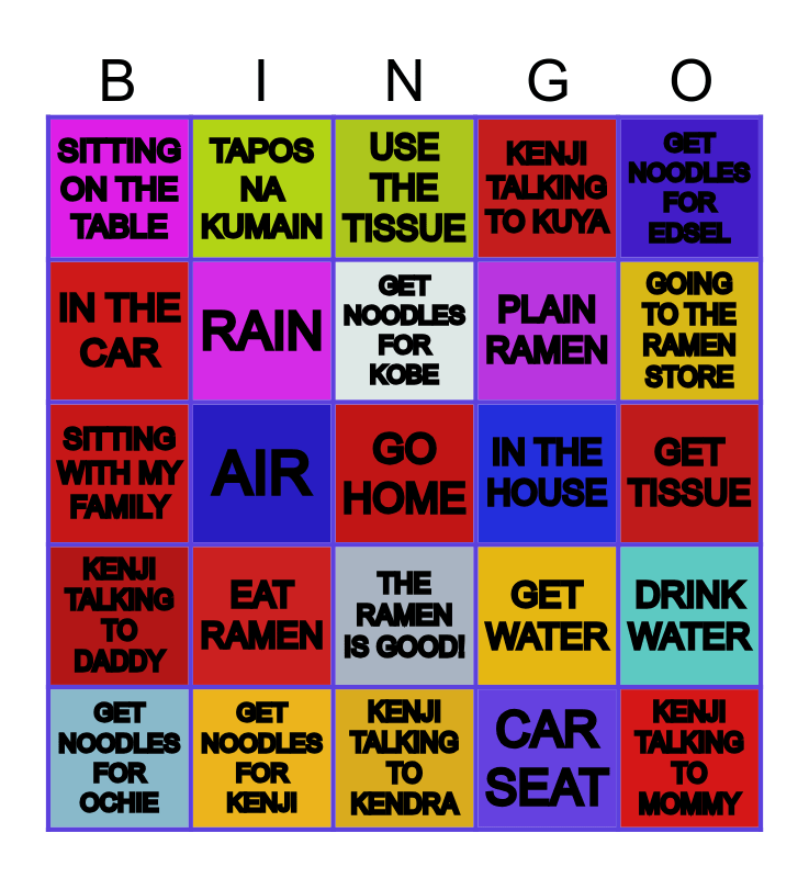 This bingo card has a free space and 24 words: EAT RAMEN, GET NOODLES FOR KENJI, GET NOODLES FOR KOBE, GET NOODLES FOR OCHIE, GET NOODLES FOR EDSEL, SITTING ON THE TABLE, IN THE CAR, TAPOS NA KUMAIN, IN THE HOUSE, THE RAMEN IS GOOD!, PLAIN RAMEN, SITTING WITH MY FAMILY, GET WATER, DRINK WATER, RAIN, CAR SEAT, GET TISSUE, USE THE TISSUE, GOING TO THE RAMEN STORE, AIR, KENJI TALKING TO MOMMY, KENJI TALKING TO DADDY, KENJI TALKING TO KUYA and KENJI TALKING TO KENDRA.
