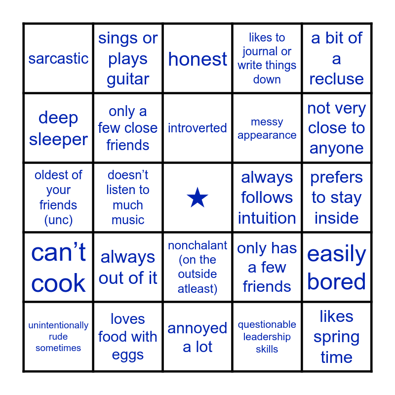 This bingo card has a free space and 24 words: always out of it, loves food with eggs, introverted, unintentionally rude sometimes, a bit of a recluse, sarcastic, deep sleeper, sings or plays guitar, always follows intuition, nonchalant (on the outside atleast), messy appearance, oldest of your friends (unc), only has a few friends, easily bored, only a few close friends, questionable leadership skills, prefers to stay inside, honest, not very close to anyone, doesn’t listen to much music, likes spring time, can’t cook, likes to journal or write things down and annoyed a lot.