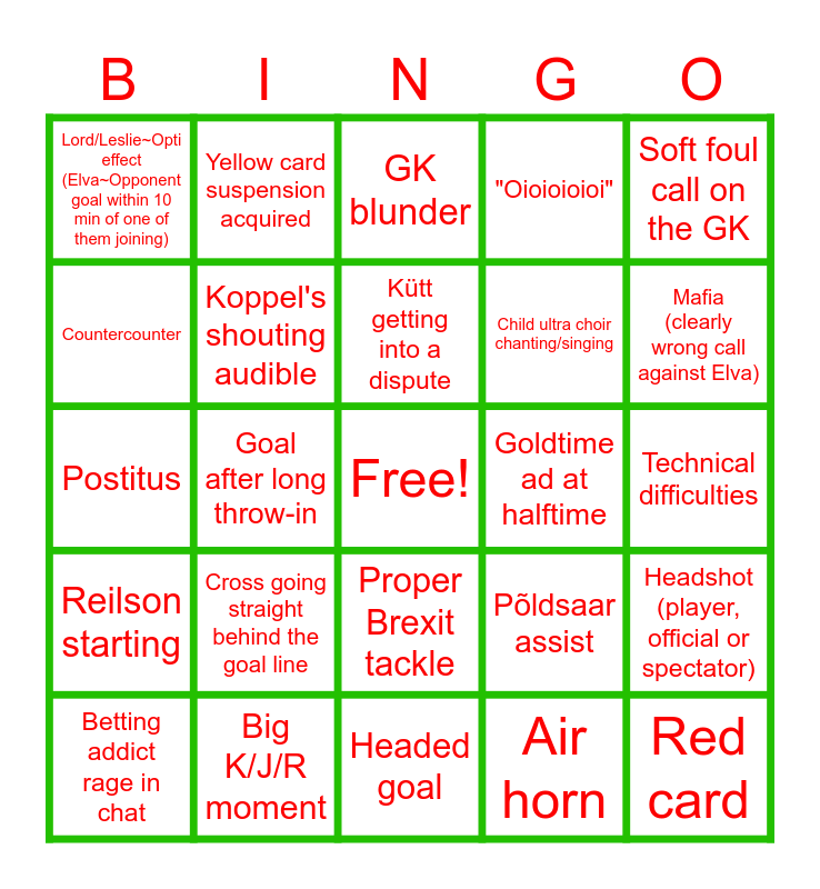 This bingo card has a free space and 41 words: "Niiiii", Postitus, Soft penalty, Koppel's shouting audible, Big K/J/R moment, Proper Brexit tackle, Kütt getting into a dispute, Goal from outside the box, Soft foul call on the GK, Reilson starting, Goal after long throw-in, "Oioioioioi", Red card, Technical difficulties, Goldtime ad at halftime, Cross going straight behind the goal line, Kruusla goal, Lord/Leslie~Opti effect (Elva~Opponent goal within 10 min of one of them joining), Own goal, GK blunder, Headshot (player, official or spectator), Non-human vertebrate on camera, Headed goal, Child ultra choir chanting/singing, Player slipping/tripping without interference, Goal in added time (1st or 2nd half), Air horn, Goal by a non-Estonian, Mafia (clearly wrong call against Elva), Cameraman not following the action, Bad weather (snow, hail, heavy rain, strong wind), Yellow card suspension acquired, Betting addict rage in chat, Opposing player with 50+ PL appearances or 50k+ € market value, Põldsaar assist, Countercounter, Ball boy juggling, Attendance above home team season average, Either team scoring with their 1st shot of either half, Nutmeg and Sanchez going for the highlight reel.