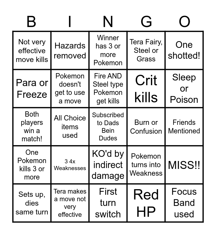 This bingo card has a free space and 24 words: 3 4x Weaknesses, Tera makes a move not very effective, Fire AND Steel type Pokemon get kills, Sets up, dies same turn, One shotted!, Not very effective move kills, Para or Freeze, Hazards removed, Burn or Confusion, KO'd by indirect damage, Crit kills, Both players win a match!, Pokemon turns into Weakness, MISS!!, Pokemon doesn't get to use a move, Red HP, Friends Mentioned, Winner has 3 or more Pokemon, Sleep or Poison, All Choice items used, Focus Band used, One Pokemon kills 3 or more, Tera Fairy, Steel or Grass and First turn switch.
