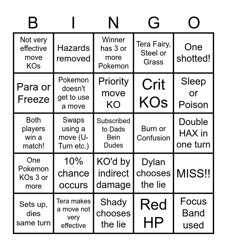 This bingo card has a free space and 24 words: 10% chance occurs, Tera makes a move not very effective, Priority move KO, Sets up, dies same turn, One shotted!, Not very effective move KOs, Para or Freeze, Hazards removed, Burn or Confusion, KO'd by indirect damage, Crit KOs, Both players win a match!, Dylan chooses the lie, MISS!!, Pokemon doesn't get to use a move, Red HP, Double HAX in one turn, Winner has 3 or more Pokemon, Sleep or Poison, Swaps using a move (U-Turn etc.), Focus Band used, One Pokemon KOs 3 or more, Tera Fairy, Steel or Grass and Shady chooses the lie.