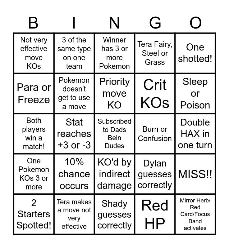 This bingo card has a free space and 24 words: 10% chance occurs, Tera makes a move not very effective, Priority move KO, 2 Starters Spotted!, One shotted!, Not very effective move KOs, Para or Freeze, 3 of the same type on one team, Burn or Confusion, KO'd by indirect damage, Crit KOs, Both players win a match!, Dylan guesses correctly, MISS!!, Pokemon doesn't get to use a move, Red HP, Double HAX in one turn, Winner has 3 or more Pokemon, Sleep or Poison, Stat reaches +3 or -3, Mirror Herb/ Red Card/Focus Band activates, One Pokemon KOs 3 or more, Tera Fairy, Steel or Grass and Shady guesses correctly.