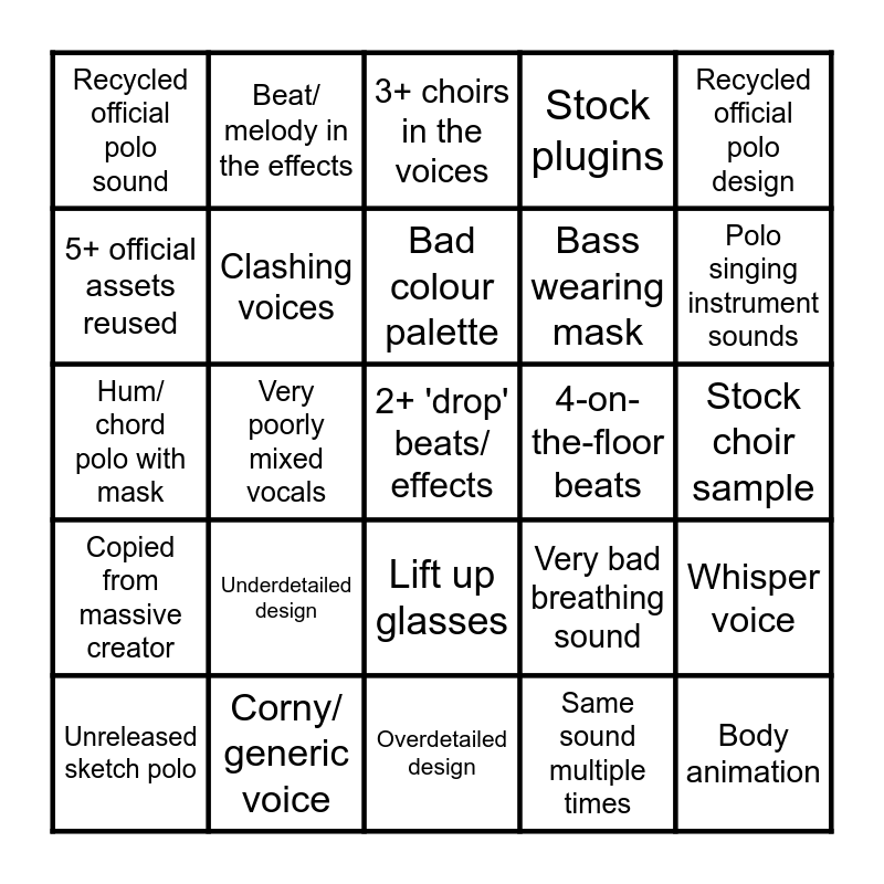 This bingo card has 25 words: Underdetailed design, Overdetailed design, Bad colour palette, Unreleased sketch polo, Recycled official polo design, Recycled official polo sound, 5+ official assets reused, Beat/ melody in the effects, 4-on-the-floor beats, Lift up glasses, Bass wearing mask, Hum/ chord polo with mask, Very bad breathing sound, Whisper voice, Clashing voices, Body animation, Stock choir sample, 3+ choirs in the voices, Polo singing instrument sounds, Very poorly mixed vocals, 2+ 'drop' beats/ effects, Corny/ generic voice, Copied from massive creator, Stock plugins and Same sound multiple times.