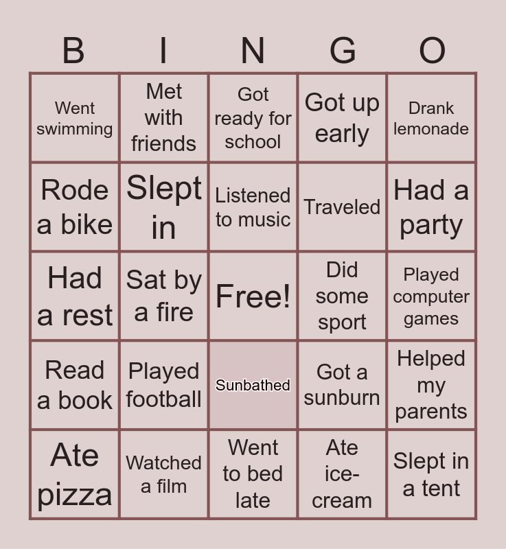 This bingo card has a free space and 24 words: Played football, Watched a film, Listened to music, Ate pizza, Drank lemonade, Went swimming, Rode a bike, Met with friends, Did some sport, Sunbathed, Traveled, Had a rest, Got a sunburn, Helped my parents, Slept in, Ate ice-cream, Played computer games, Got ready for school, Had a party, Sat by a fire, Slept in a tent, Read a book, Got up early and Went to bed late.