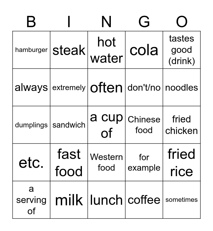 This bingo card has 44 words: a piece of, a cup of, general measure word, a serving of, tea, coffee, hot water, tastes good (food), tastes good (drink), milk, cola, Chinese food, Western food, fast food, breakfast, lunch, dinner, dumplings, steamed buns, noodles, steak, salad, pizza, hamburger, fries, fried chicken, porridge, fried bread stick, for example, etc., plain rice, fried rice, bread, egg, sandwich, never, rarely, sometimes, often, always, don't/no, very/really, extremely and most.