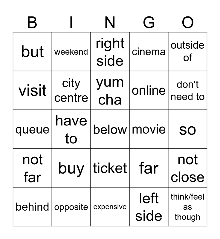 This bingo card has 45 words: above, below, in front of, behind, next to, left side, right side, inside of, outside of, opposite, cinema, movie, ticket, buy, cheap, expensive, how much money?, queue, need to, don't need to, weekend, plans, although, but, because, so, first, then, far, not far, close, not close, Chinese people, culture, interesting, have to, no need to, have free time, think/feel as though, yum cha, visit, online, Chinatown, city centre and train.