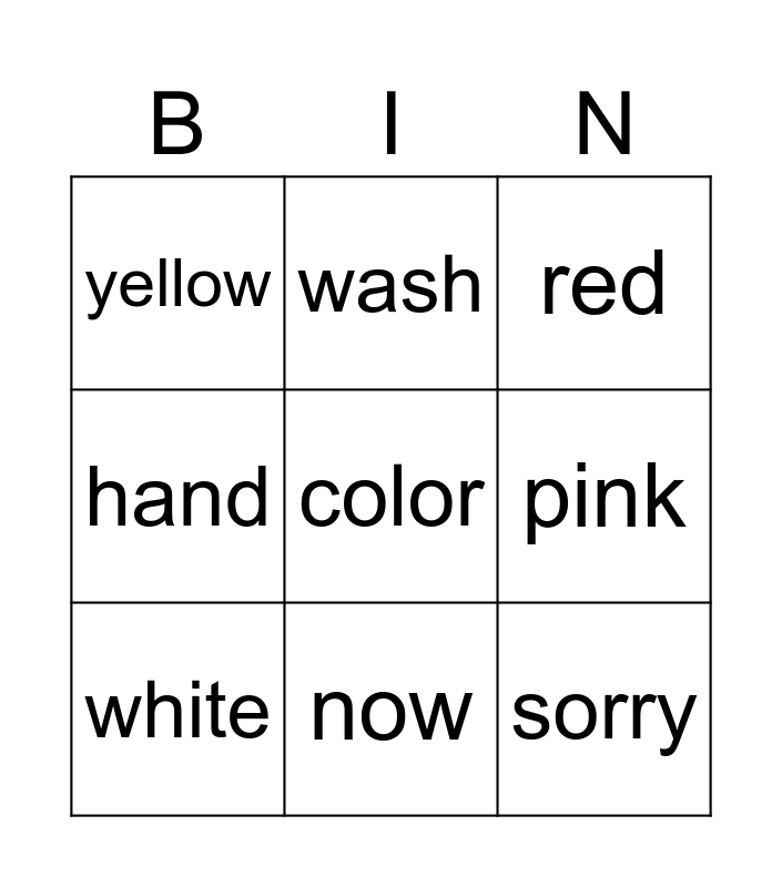 This bingo card has a free space and 11 words: black, blue, pink, white, red, yellow, now, green, hand, wash and sorry.