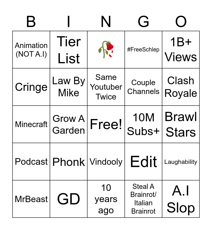 This bingo card has a free space and 24 words: Phonk, GD, Same Youtuber Twice, MrBeast, 1B+ Views, Animation (NOT A.I), Cringe, Tier List, 10M Subs+, Vindooly, Couple Channels, Minecraft, Edit, Laughability, Law By Mike, Steal A Brainrot/ Italian Brainrot, Brawl Stars, 🥀, Clash Royale, Grow A Garden, A.I Slop, Podcast, #FreeSchlep and 10 years ago.