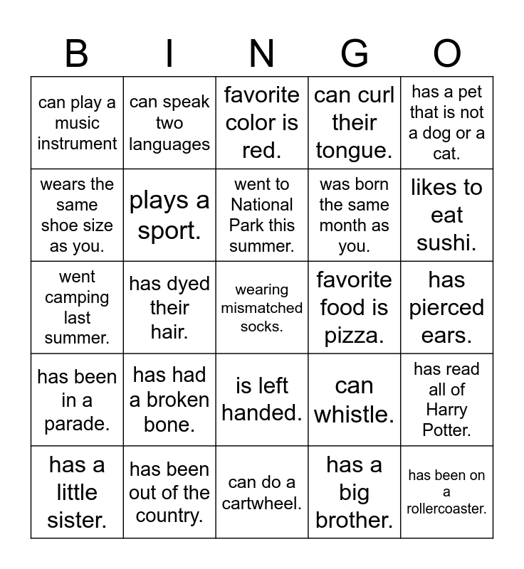 This bingo card has a free space and 24 words: has had a broken bone., has been out of the country., went to National Park this summer., has a little sister., has a pet that is not a dog or a cat., can play a music instrument, wears the same shoe size as you., can speak two languages, favorite food is pizza., is left handed., was born the same month as you., went camping last summer., can whistle., has read all of Harry Potter., plays a sport., has a big brother., has pierced ears., favorite color is red., likes to eat sushi., has dyed their hair., has been on a rollercoaster., has been in a parade., can curl their tongue. and can do a cartwheel..