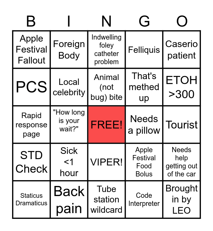This bingo card has a free space and 24 words: Sick <1 hour, Back pain, Animal (not bug) bite, Staticus Dramaticus, Caserio patient, Apple Festival Fallout, PCS, Foreign Body, Needs a pillow, VIPER!, That's methed up, Rapid response page, Apple Festival Food Bolus, Needs help getting out of the car, Local celebrity, Code Interpreter, Tourist, Indwelling foley catheter problem, ETOH >300, "How long is your wait?", Brought in by LEO, STD Check, Felliquis and Tube station wildcard.