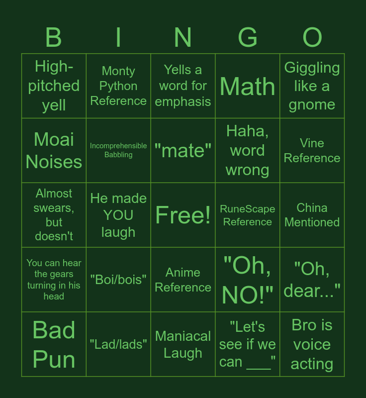 This bingo card has a free space and 24 words: "Boi/bois", "Lad/lads", "mate", Bad Pun, Giggling like a gnome, High-pitched yell, Moai Noises, Monty Python Reference, RuneScape Reference, Anime Reference, Haha, word wrong, Almost swears, but doesn't, "Oh, NO!", "Oh, dear...", Incomprehensible Babbling, "Let's see if we can ___", China Mentioned, Yells a word for emphasis, Vine Reference, He made YOU laugh, Bro is voice acting, You can hear the gears turning in his head, Math and Maniacal Laugh.