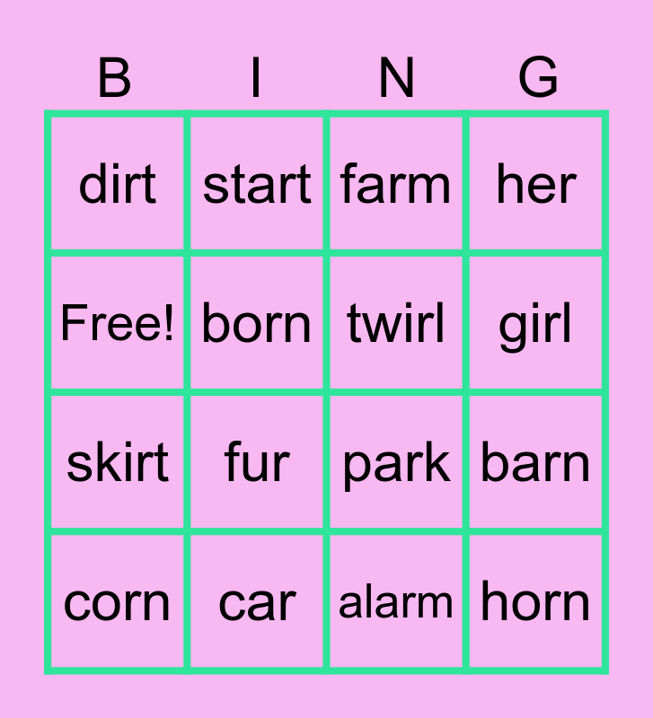 This bingo card has 16 words: car, barn, farm, dirt, skirt, start, park, alarm, Free!, born, corn, her, fur, girl, twirl and horn.