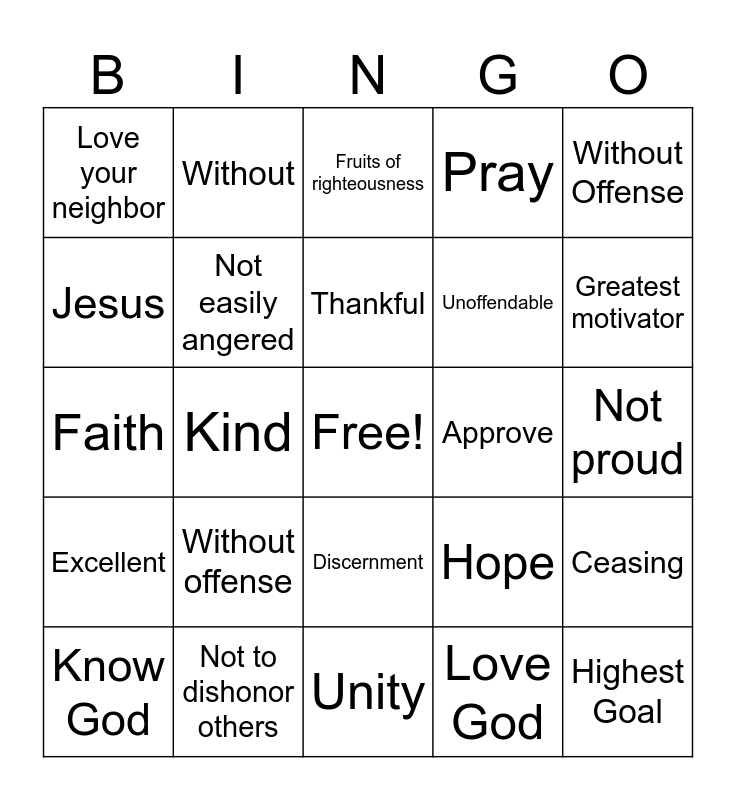 This bingo card has a free space and 29 words: Know God, Patient, Kind, Not self seeking, Love your neighbor, Fruits of righteousness, Not easily angered, Without offense, Approve, Not to dishonor others, Not proud, Highest Goal, Unity, Love God, Greatest motivator, Knowledge, Discernment, Excellent, Without Offense, Faith, Hope, Love, Unoffendable, Jesus, Pray, Without, Ceasing, Thankful and Praise Him.
