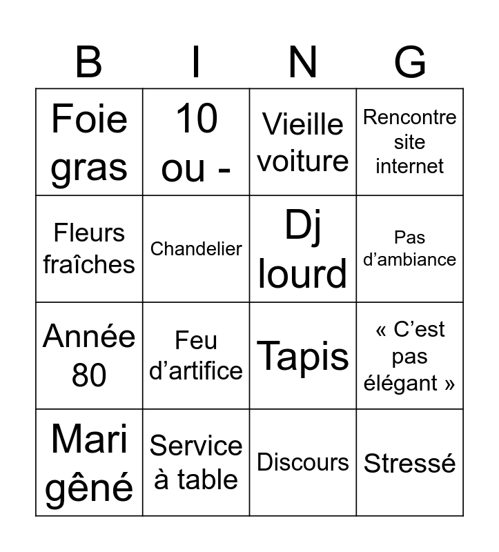 This bingo card has 16 words: Service à table, « C’est pas élégant », Vieille voiture, Foie gras, Année 80, 10 ou -, Tapis, Discours, Fleurs fraîches, Chandelier, Mari gêné, Rencontre site internet, Feu d’artifice, Pas d’ambiance, Dj lourd and Stressé.