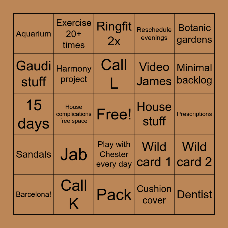 This bingo card has a free space and 24 words: Jab, Call K, Call L, Barcelona!, Botanic gardens, Aquarium, Gaudi stuff, Exercise 20+ times, House stuff, Play with Chester every day, Video James, 15 days, Wild card 1, Wild card 2, Harmony project, Cushion cover, Prescriptions, Ringfit 2x, Minimal backlog, House complications free space, Dentist, Sandals, Reschedule evenings and Pack.