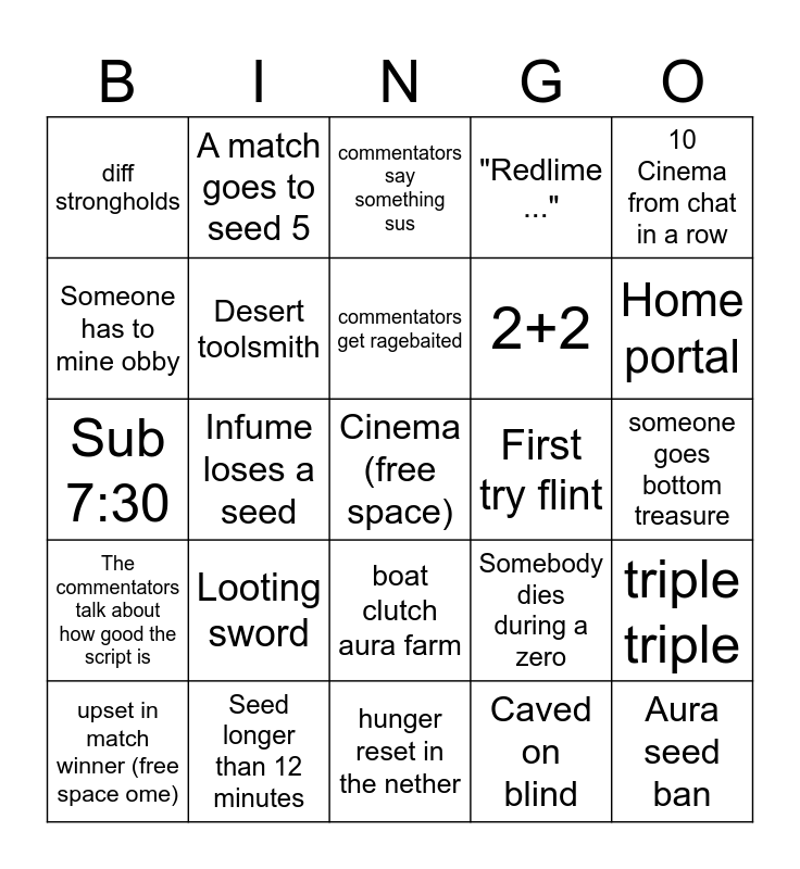 This bingo card has a free space and 33 words: A commentator says "Cinema", 2 + deaths in one seed (no hunger reset), Infume loses a seed, Someone wins a seed with a one-cycle, The commentators talk about how good the script is, Desert toolsmith, 10 Cinema from chat in a row, upset in match winner (free space ome), A match goes to seed 5, 3-0, commentators get ragebaited, commentators say something sus, emote farming, someone builds a neo on the fountain, First try flint, Home portal, Seed longer than 12 minutes, Sub 7:30, Looting sword, Somebody dies during a zero, boat clutch aura farm, Not quite Nine lives, diff strongholds, someone goes bottom treasure, hunger reset in the nether, Aura seed ban, "Redlime ...", 2+2, Someone has to mine obby, triple triple, Ocean exposed, Caved on blind and full reset.