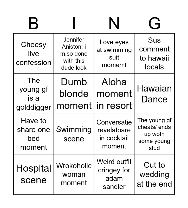 This bingo card has 16 words: Wrokoholic woman moment, The young gf cheats/ ends up woth some young stud, Love eyes at swimming suit momemt, Cheesy live confession, Have to share one bed moment, Jennifer Aniston: i m.so done with this dude look, Conversatie revelatoare in cocktail moment, Weird outfit cringey for adam sandler, The young gf is a golddigger, Dumb blonde moment, Hospital scene, Sus comment to hawaii locals, Swimming scene, Hawaian Dance, Aloha moment in resort and Cut to wedding at the end.