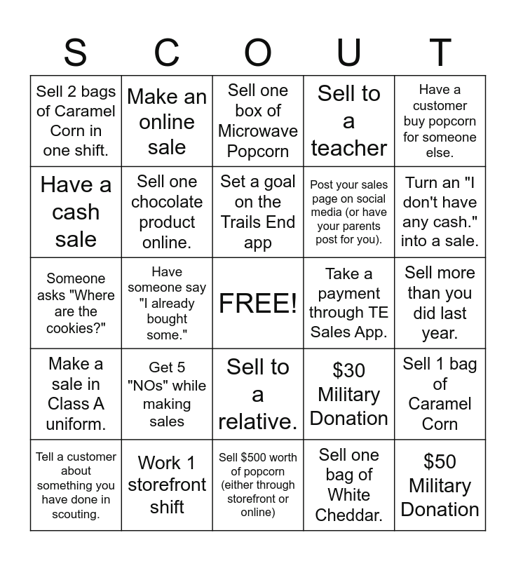 This bingo card has a free space and 24 words: Get 5 "NOs" while making sales, Work 1 storefront shift, Set a goal on the Trails End app, Tell a customer about something you have done in scouting., Have a customer buy popcorn for someone else., Sell 2 bags of Caramel Corn in one shift., Have a cash sale, Make an online sale, Take a payment through TE Sales App., Sell to a relative., Post your sales page on social media (or have your parents post for you)., Someone asks "Where are the cookies?", $30 Military Donation, Sell 1 bag of Caramel Corn, Sell one chocolate product online., Sell one bag of White Cheddar., Sell more than you did last year., Sell one box of Microwave Popcorn, Turn an "I don't have any cash." into a sale., Have someone say "I already bought some.", $50 Military Donation, Make a sale in Class A uniform., Sell to a teacher and Sell $500 worth of popcorn (either through storefront or online).