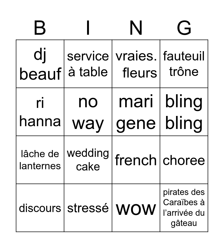 This bingo card has 16 words: discours, stressé, vraies. fleurs, fauteuil trône, ri hanna, service à table, french, choree, dj beauf, no way, wow, bling bling, lâche de lanternes, wedding cake, mari gene and pirates des Caraïbes à l’arrivée du gâteau.