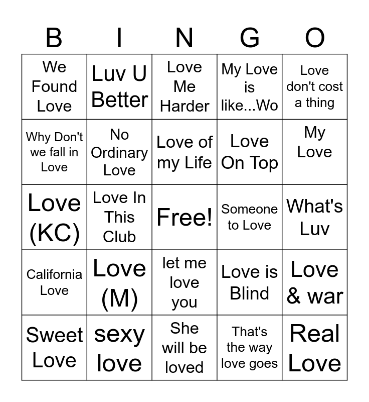 This bingo card has a free space and 24 words: Love (M), sexy love, Love of my Life, Sweet Love, Love don't cost a thing, We Found Love, Why Don't we fall in Love, Luv U Better, Someone to Love, let me love you, Love On Top, Love (KC), Love is Blind, Love & war, No Ordinary Love, That's the way love goes, What's Luv, Love Me Harder, My Love, Love In This Club, Real Love, California Love, My Love is like...Wo and She will be loved.