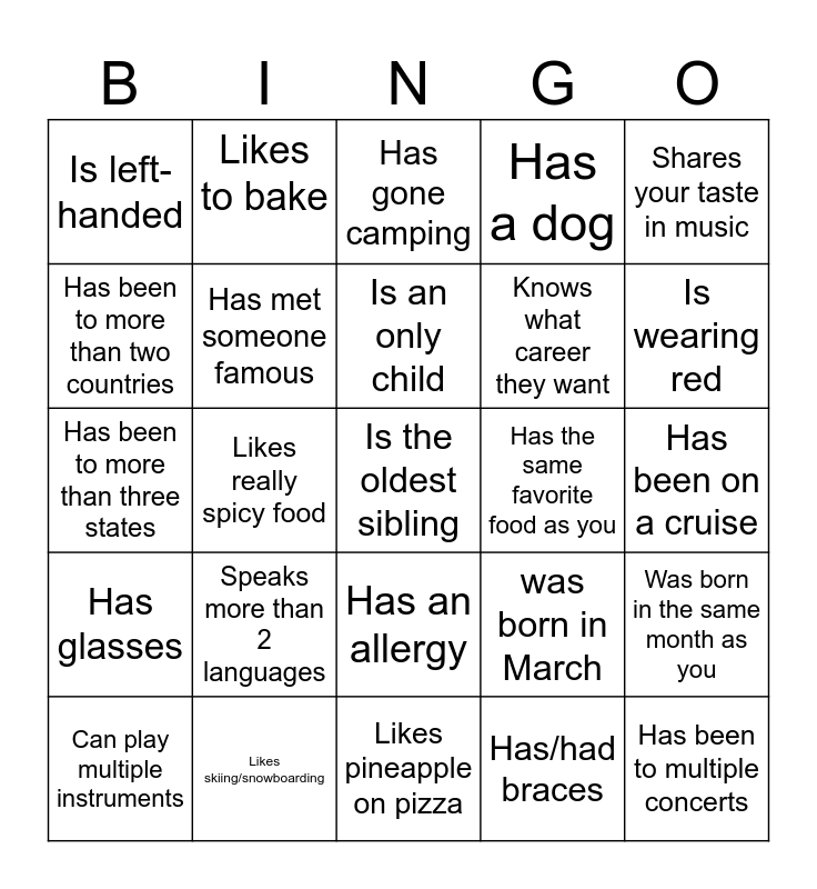 This bingo card has 25 words: Speaks more than 2 languages, Likes pineapple on pizza, Is an only child, Can play multiple instruments, Shares your taste in music, Is left-handed, Has been to more than two countries, Likes to bake, Has the same favorite food as you, Has an allergy, Knows what career they want, Has been to more than three states, was born in March, Was born in the same month as you, Has met someone famous, Has been to multiple concerts, Has been on a cruise, Has gone camping, Is wearing red, Likes really spicy food, Is the oldest sibling, Likes skiing/snowboarding, Has glasses, Has a dog and Has/had braces.
