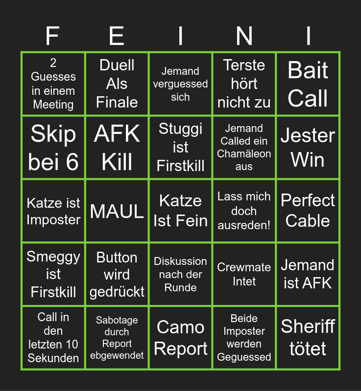 This bingo card has a free space and 24 words: Button wird gedrückt, Sabotage durch Report ebgewendet, Stuggi ist Firstkill, Call in den letzten 10 Sekunden, Bait Call, 2 Guesses in einem Meeting, Skip bei 6, Duell Als Finale, Lass mich doch ausreden!, Diskussion nach der Runde, Jemand Called ein Chamäleon aus, Katze ist Imposter, Crewmate Intet, Jemand ist AFK, AFK Kill, Beide Imposter werden Geguessed, Perfect Cable, Jemand verguessed sich, Jester Win, MAUL, Sheriff tötet, Smeggy ist Firstkill, Terste hört nicht zu and Camo Report.
