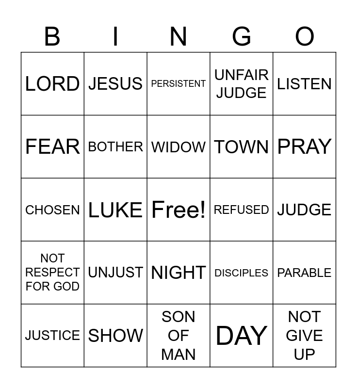 This bingo card has a free space and 24 words: UNJUST, SHOW, WIDOW, JUSTICE, LISTEN, LORD, FEAR, JESUS, REFUSED, NIGHT, TOWN, CHOSEN, DISCIPLES, PARABLE, BOTHER, DAY, JUDGE, PERSISTENT, PRAY, LUKE, NOT GIVE UP, NOT RESPECT FOR GOD, UNFAIR JUDGE and SON OF MAN.