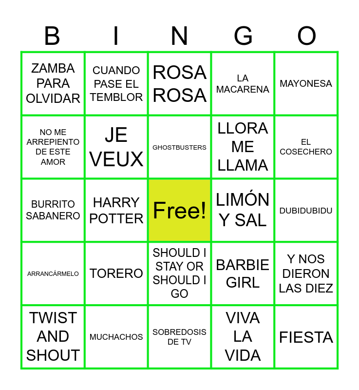 This bingo card has a free space and 58 words: PEDRO, MUCHACHOS, COMO ALÍ, ARRANCÁRMELO, VIVA LA VIDA, EL EMBRUJO, JE VEUX, HOLA PERDIDA, LLORA ME LLAMA, MENEAITO, LA MACARENA, LA MOROCHA, YMCA, CAMBALACHE, JUMP, ZAMBA PARA OLVIDAR, FIESTA, MAYONESA, START ME UP, GHOSTBUSTERS, LIMÓN Y SAL, ROSA ROSA, TWIST AND SHOUT, Y NOS DIERON LAS DIEZ, JI JI JI, DUBIDUBIDU, DE BOLICHE EN BOLICHE, AMOR A LA MEXICANA, EL COSECHERO, MI AMIGO EL PUMA, WE WILL ROCK YOU, GUARDA COME DONDOLO, TWIST DEL MONO LISO, CUMBIA DEL MONSTRUO DE LA LAGUNA, PAPAYA, LA CHICA DEL BIKINI AZUL, AVENGERS, HARRY POTTER, BURRITO SABANERO, NOS SIGUEN PEGANDO ABAJO, TORERO, COLOR ESPERANZA, BARBIE GIRL, BLITZKRIEG BOP, LOCO UN POCO, QUE ME PISEN, SHAKIRA BIZARRAP, SHOULD I STAY OR SHOULD I GO, SOBREDOSIS DE TV, OTRA VEZ EN LA VÍA, WEDNESDAY MAIN TITLES, YOU COULD BE MINE, ¿QUÉ VES?, CARNAVAL TODA LA VIDA, CUANDO PASE EL TEMBLOR, DON, NO ME ARREPIENTO DE ESTE AMOR and INOCENTE.