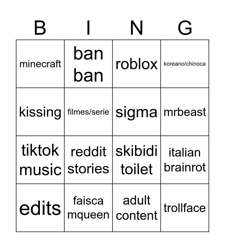This bingo card has 16 words: faisca mqueen, italian brainrot, roblox, minecraft, tiktok music, ban ban, skibidi toilet, adult content, kissing, filmes/serie, edits, koreano/chinoca, reddit stories, mrbeast, sigma and trollface.