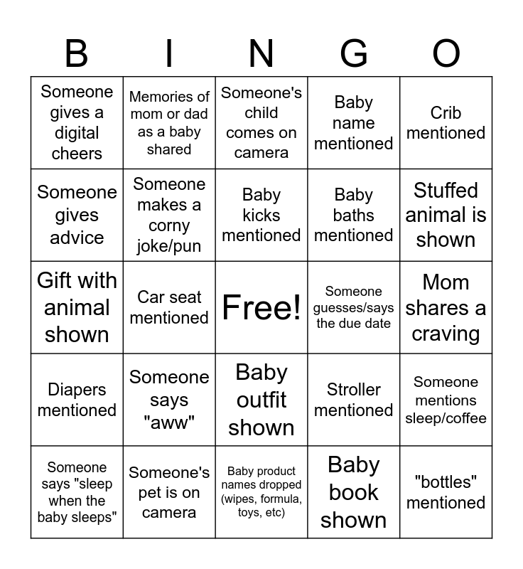 This bingo card has a free space and 24 words: Someone says "aww", Someone's pet is on camera, Baby kicks mentioned, Someone says "sleep when the baby sleeps", Crib mentioned, Someone gives a digital cheers, Someone gives advice, Memories of mom or dad as a baby shared, Someone guesses/says the due date, Baby outfit shown, Baby baths mentioned, Gift with animal shown, Stroller mentioned, Someone mentions sleep/coffee, Someone makes a corny joke/pun, Baby book shown, Mom shares a craving, Someone's child comes on camera, Stuffed animal is shown, Car seat mentioned, "bottles" mentioned, Diapers mentioned, Baby name mentioned and Baby product names dropped (wipes, formula, toys, etc).
