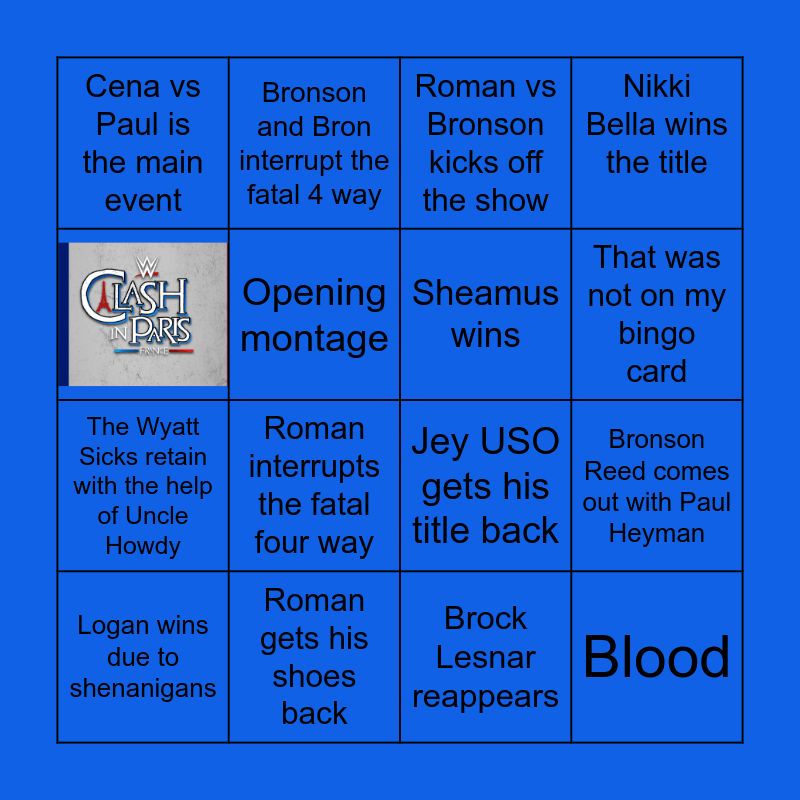 This bingo card has 1 images and 15 words: Roman gets his shoes back, Bronson Reed comes out with Paul Heyman, Roman vs Bronson kicks off the show, Cena vs Paul is the main event, The Wyatt Sicks retain with the help of Uncle Howdy, Bronson and Bron interrupt the fatal 4 way, Jey USO gets his title back, Brock Lesnar reappears, Opening montage, Logan wins due to shenanigans, Nikki Bella wins the title, Roman interrupts the fatal four way, That was not on my bingo card, Sheamus wins and Blood.