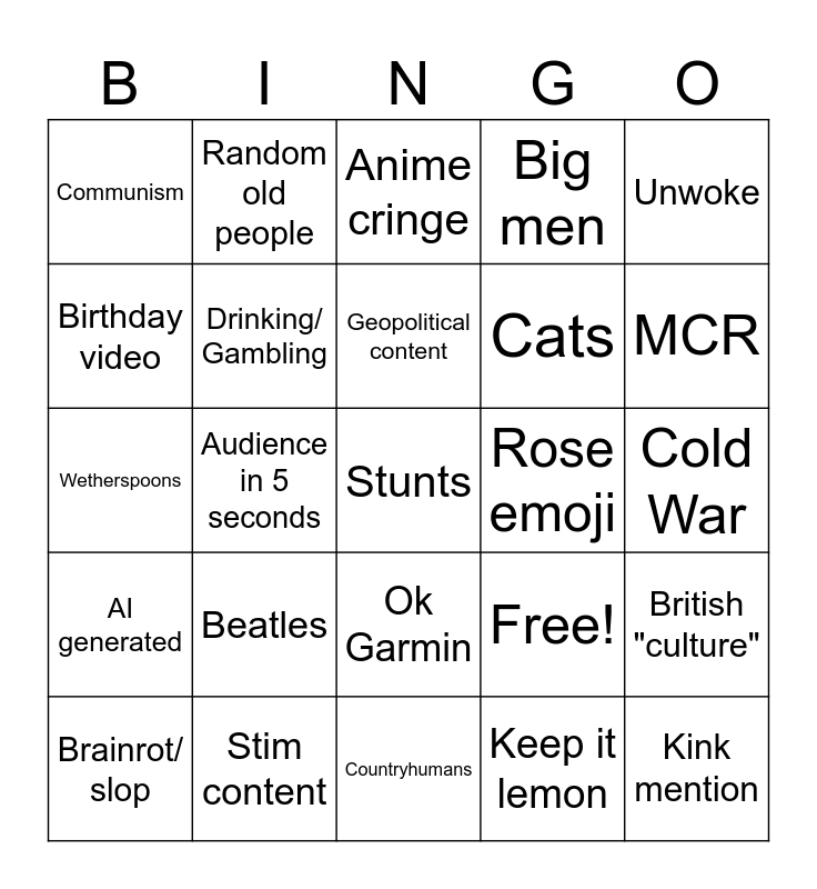 This bingo card has 25 words: Beatles, Countryhumans, Geopolitical content, Brainrot/ slop, Unwoke, Communism, Birthday video, Random old people, Rose emoji, Ok Garmin, Cats, Wetherspoons, Free!, British "culture", Drinking/ Gambling, Kink mention, Cold War, Anime cringe, MCR, Audience in 5 seconds, Stunts, Stim content, AI generated, Big men and Keep it lemon.