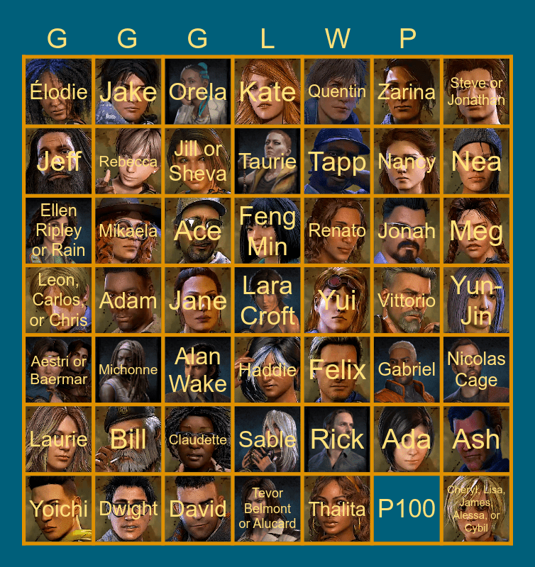 This bingo card has 48 images and 49 words: Ada, Nancy, Thalita, Adam, Ace, Yun-Jin, Jake, David, Zarina, Haddie, Steve or Jonathan, Kate, Jonah, Renato, Bill, Vittorio, Jeff, Nea, Ash, Quentin, Tapp, Jane, Élodie, Rebecca, Yoichi, Jill or Sheva, Meg, Dwight, Feng Min, Mikaela, Cheryl, Lisa, James, Alessa, or Cybil, Yui, Laurie, Claudette, Leon, Carlos, or Chris, Felix, Gabriel, Nicolas Cage, Ellen Ripley or Rain, Alan Wake, Sable, Aestri or Baermar, Lara Croft, Tevor Belmont or Alucard, Taurie, Orela, Rick, Michonne and P100.