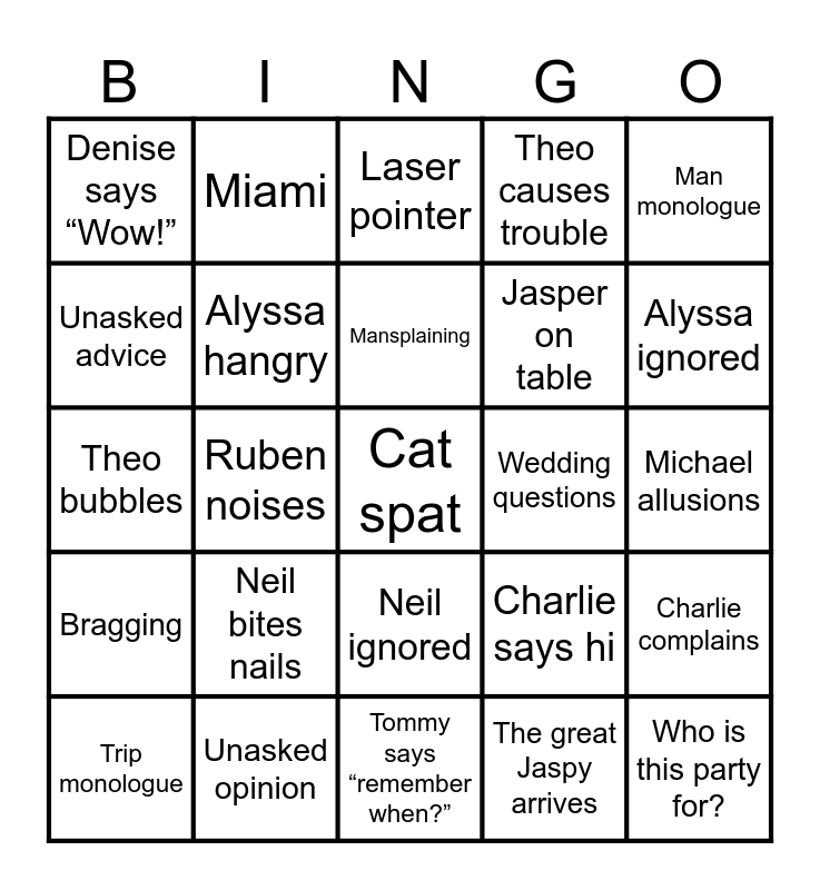 This bingo card has a free space and 24 words: Neil bites nails, Unasked opinion, Mansplaining, Trip monologue, Man monologue, Denise says “Wow!”, Unasked advice, Miami, Wedding questions, Neil ignored, Jasper on table, Theo bubbles, Charlie says hi, Charlie complains, Alyssa hangry, The great Jaspy arrives, Michael allusions, Laser pointer, Alyssa ignored, Ruben noises, Who is this party for?, Bragging, Theo causes trouble and Tommy says “remember when?”.
